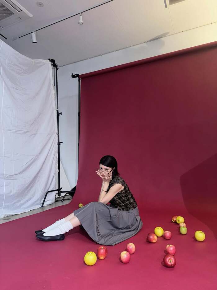また、床にちょこんと座ったメガネ姿の王林さんも。りんごと映った王林さんは、どこか知的な雰囲気が出ています。