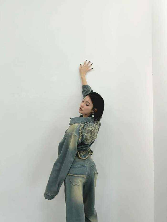 投稿された写真には、白壁に手をつく、全身デニムコーデで決めた王林さんの姿が。