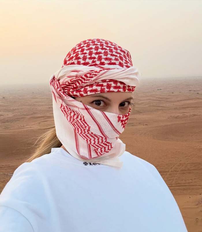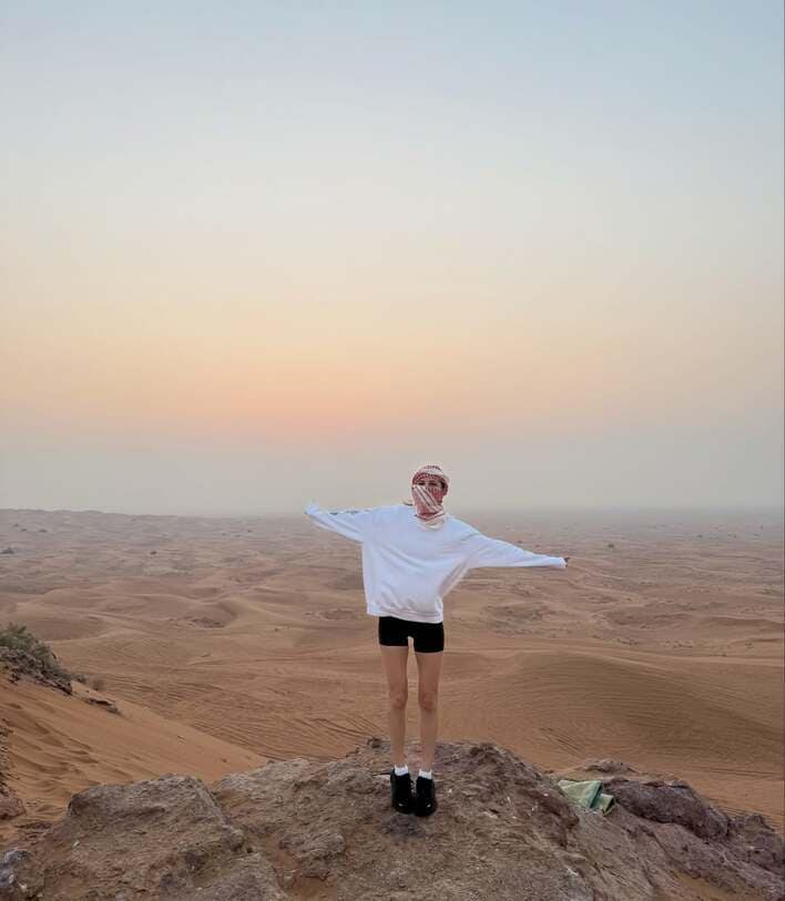 マギーさんは、「せっかくのドバイ!初めて砂漠のほうへ!」とつづり、ドバイの砂漠を背にしたショットを披露。