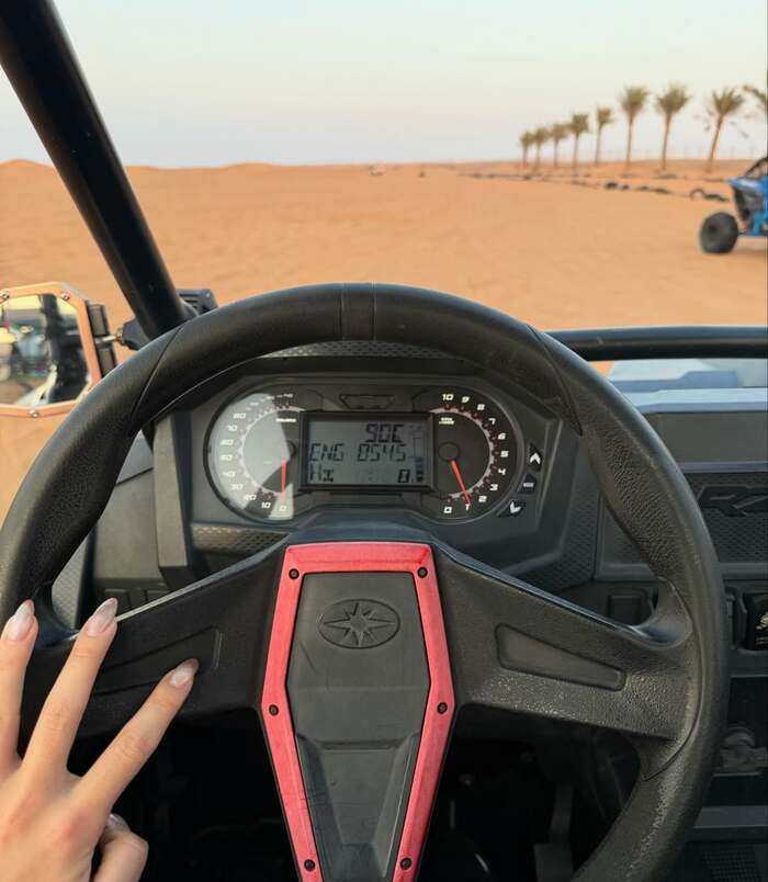 そんなマギーさんは、砂漠でのバギーの運転に挑戦!バギーは砂の上でもよく進みそうな凹凸の激しい大きなタイヤが特徴的。ハンドルを握ったマギーさんは、楽しそうな雰囲気でピースポーズ♪