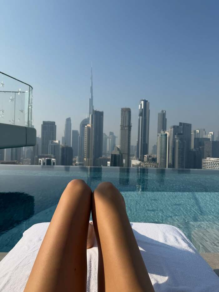 マギーさん視線でとらえられた1枚には、ほっそりとした美脚と、大きなプール、そして高層ビルやタワーなどが建ち並ぶドバイの街並みが広がっています。