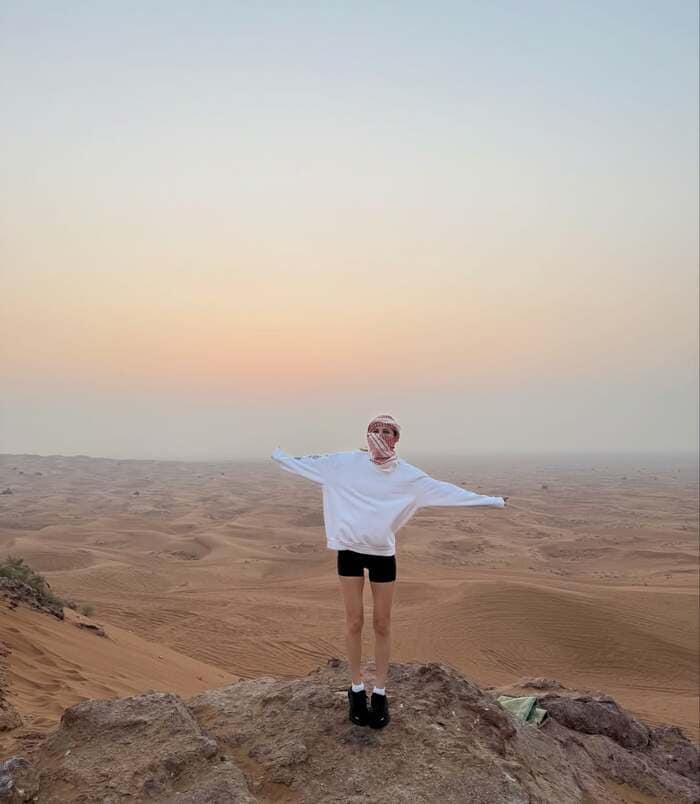 真っ白なパーカーにピチッとした黒のショーパン姿のマギーさんは、両手を横に広げて、全身で砂漠を体感してる様子。どこまでも続く砂の地と、うっすらとオレンジに色に染まった空とのコラボレーションがとても美しいです。