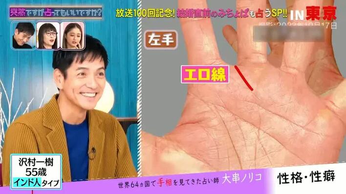 大串さんは、沢村さんの手相を見ると「ギラギラしてる。珍しい」とコメント。人差し指に向かって“向上線”が伸びているため「野心の塊」、線1本1本がはっきりしていることから「すごく神経質」と鑑定しました。