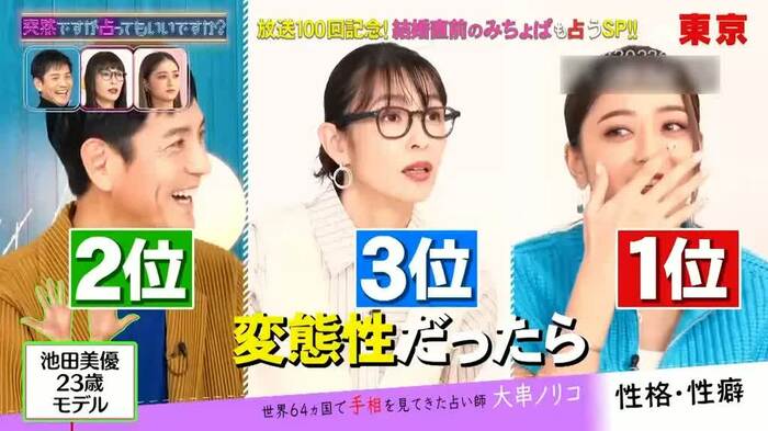 大串さんは「性欲だったら、1位:沢村さん、2位:池田さん、3位:水野さん。変態性だったら、1位:池田さん、2位:沢村さん、3位:水野さん」と鑑定。池田さんは「超ノーマルだから!」と動揺しますが、大串さんは「エロ線は、美意識が高い人にも出る」とフォローしました。