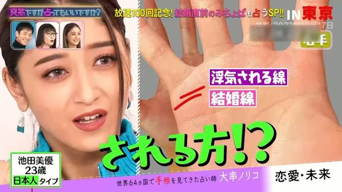 しかし、大串さんは「結婚線の上に“浮気される線”が入っている」と不穏な発言。「浮気されて離婚しやすい」と告げますが、池田さんは「(自分に)バレなきゃいい」と、考えを明かしました。