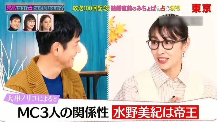 11月21日(月)放送の『突然ですが占ってもいいですか?』(フジテレビ)は、番組放送100回記念。当番組でフォーチュンウォッチャーを務める沢村一樹さん、水野美紀さん、池田さんが、大串ノリコさんに占われました。