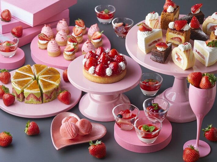 ナポレオンパイ、ロールケーキ、タルト、グラスデザートなど、多彩ないちごスイーツが並び、今年も真紅に染まる華やかさ。