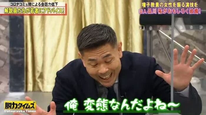 品川:(神妙な面持ちで)実は……俺、変態なんだよね~(と、豹変)!変態だから~、夜になると変なことしちゃうかもしれない!変態って、なんかやる変態じゃなくて、もっとすごい変態!なんか外でやっちゃうかもしんない。ガラスとかあったら、ペロペロペロって、ペロペロってね。(しつこく続けて)よその家の隣に行って、ペロペロペロ…ペロペロペロ…って…。
