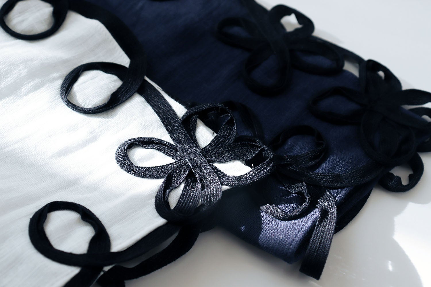 チュールのテープを特殊ミシンで止めつけ、バラが連なって咲いているように見える立体的なデザイン。生地は綿100%のダブルガーゼで柔らかく、アイロン不要。ホワイト、ラベンダー、ベージュ、ブラックの4色の他、グリーンはオンラインのみの限定販売。