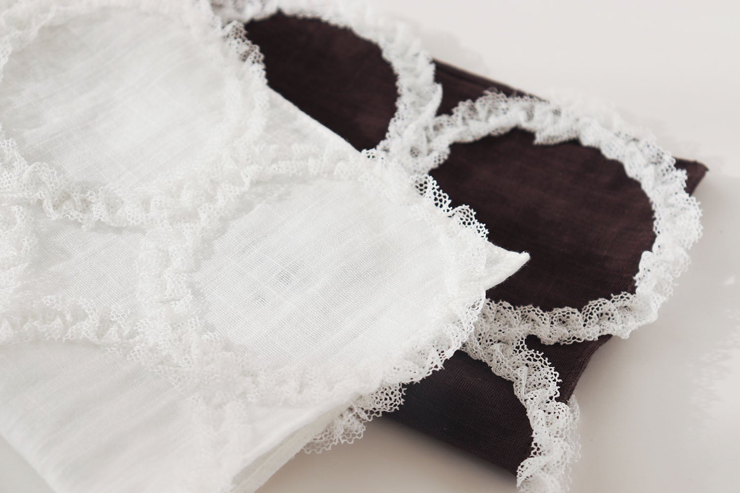 色は白×黒のモノトーン、ネイビー×黒のシックな色合い。ハンカチ本体の生地は綿100%のダブルガーゼ、柔らかくアイロン不要です。