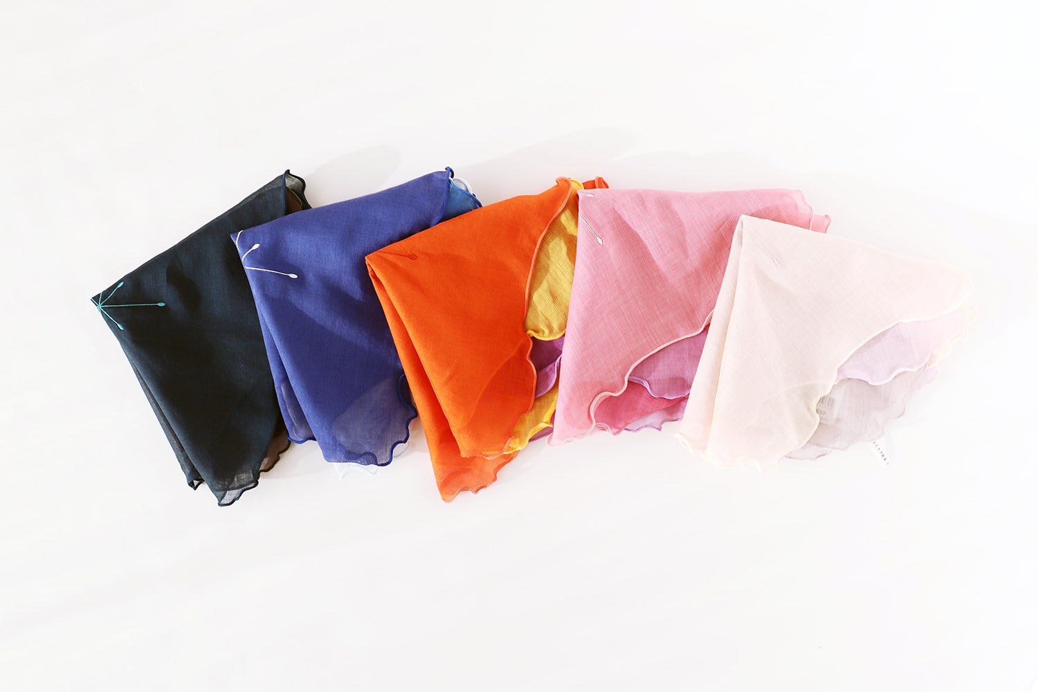 極薄の生地を三枚重ねることで生まれる、独特の配色美が魅力のハンカチーフ。折々の美しい日本の空の色をイメージしたNavy「闇夜」、Blue「蒼天」、Orange「茜雲」、Pink「花曇」、Gray「鳥曇」の5色を展開。フリルの華やかさから、ポケットチーフとしてもおすすめです。