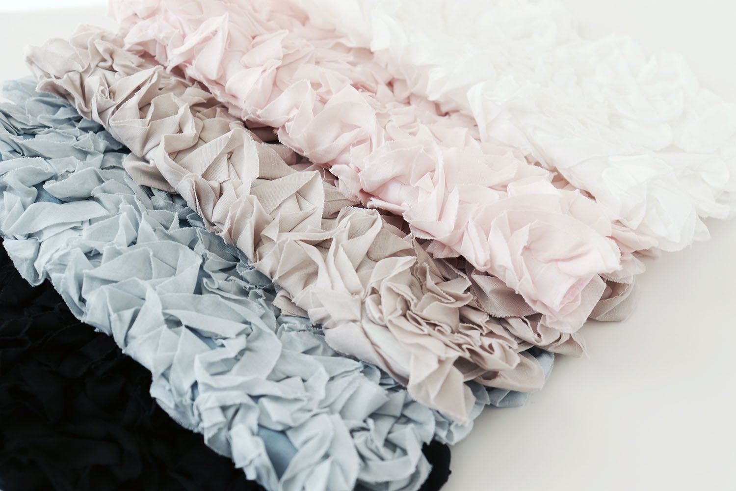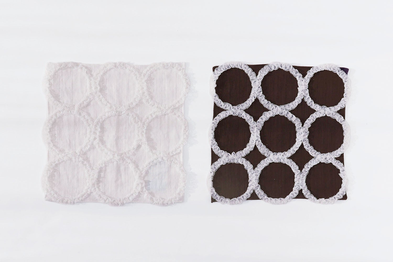 小さなドットが入っているチュールテープを特殊ミシンで9個のリングが並ぶように止めつけました。クシュクシュとしたリングが花のリースのようにも見える立体感のあるハンカチです。ホワイトとブラウンの2色を展開します。