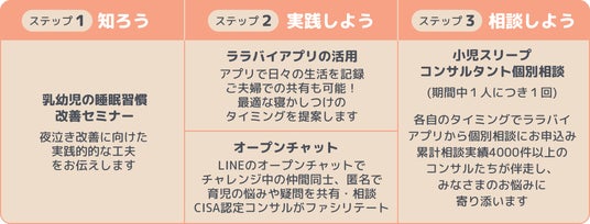 - 伴走型サポート:CISA認定小児スリープコンサルタントが、個別の悩みに寄り添って伴走サポート