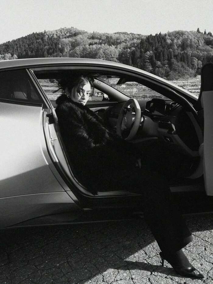 さらに車の横に立ち、ボンネット部分に片手を置き、クールにポージングしたモノクロショットも。まるで雑誌の1ページのようで、かっこいいですね。