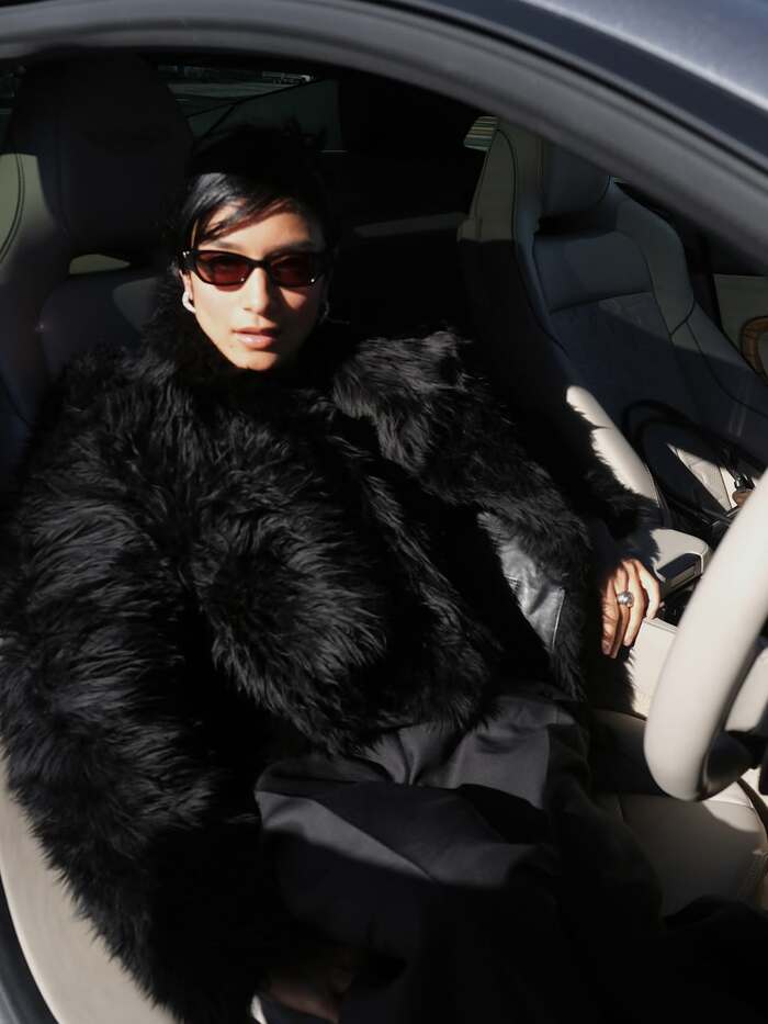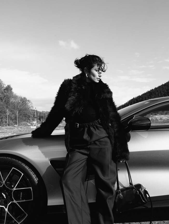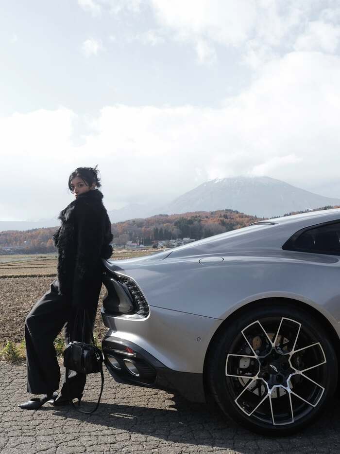 美しい山がそびえ立つのどかな田園風景を背に、ローラさんは全身ブラックのシックなスタイルで、優雅な雰囲気ただよう車が似合っています。