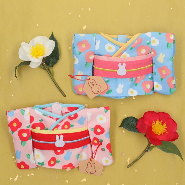 2025年12月19日(金)よりフラワーミッフィーにて、人気の着せかえほわほわぬいぐるみ専用のお洋服の新作を販売いたします。季節のお花「椿」をあしらった「Flower Miffy 着せかえお洋服 振袖つばき」は、フラワーミッフィーでは初めての振袖デザインで、「かんつばき」と「べにつばき」の2色展開。ミッフィーのシルエットの帯留めがかわいらしい、華やかなアイテムです。