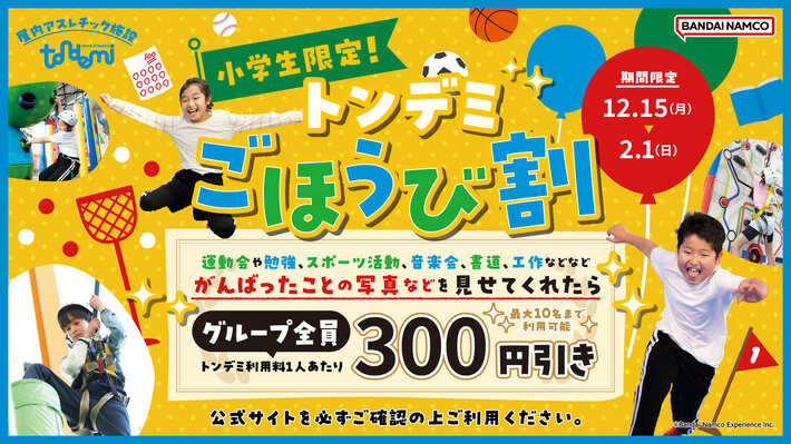 株式会社バンダイナムコエクスペリエンスが企画・プロデュースする屋内アスレチック施設『トンデミ』にて、2025年12月15日(月)~2026年2月1日(日)の期間中、小学生のお子さまがテストや習い事などで頑張った写真などを入場時に提示すると最大10名までトンデミ利用料金がおトク(※1)になる「ごほうび割」を実施します。