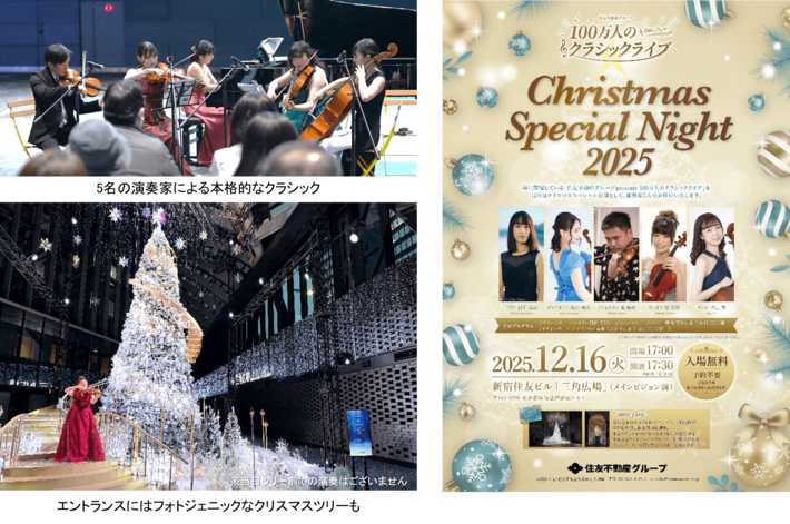 住友不動産グループは、12月16日(火)新宿住友ビル三角広場において、一般財団法人100万人のクラシックライブとともに、プロの演奏家によるクリスマスコンサート「Christmas Special Night 2025」を開催いたします。