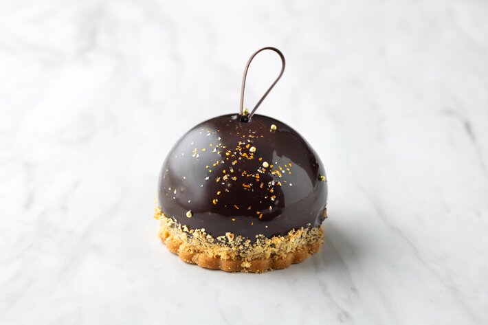 なめらかな口どけのチョコレートムースに、香り高いマンダリンのムースを重ねた華やかな二層仕立てのケーキ。香ばしいほろ苦さのカカオニブとバターの風味が広がるサブレを合わせ、食感にもこだわりました。
