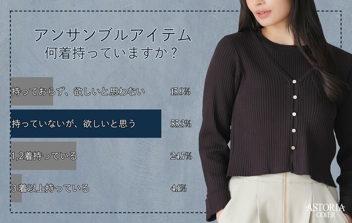 通勤・お出かけにぴったりな、上品でフェミニンなアイテムを提案する株式会社アストリア(本社:東京都文京区、代表取締役:安藤康成)は、12月9日(火)より12月21日(日)の期間限定でセリーンニットアンサンブルを500円OFFの特別価格でご提供いたします。アストリアオディール X公式アカウントで「アンサンブルアイテム 何着持っていますか?」というアンケートを実施いたしました。結果、半数以上が「持っていないが、欲しいと思う」とのご回答をいただき、アンサンブルを着てみたいもののお買い求めにまで至らないことが分かりました。このアンケート結果を受けましてASTORIA ODIERでは、アンサンブルをまだお持ちでないお客様が初めて取り入れやすいアイテムとして、「300日着られるニット」のシリーズよりセリーンニットアンサンブルをお求めやすい価格でご提供いたします。この機会にぜひ、実用性と美しさを兼ね備えたアイテムを是非ご体感ください。