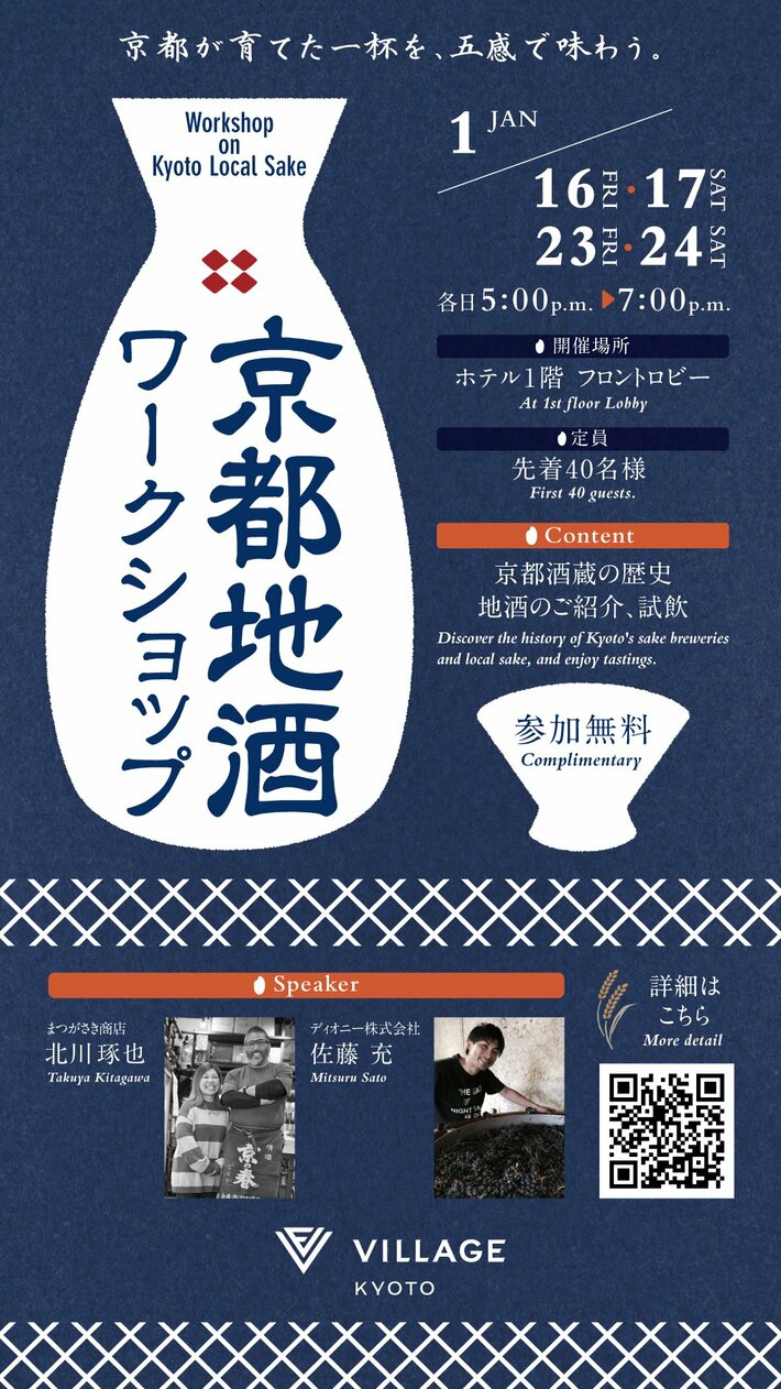 ヴィラージュ京都は、地域と連携した文化体験を提供し、お客様と京都の伝統が出会う機会を創出するホテルとして様々なサービスをご提供しております。本ワークショップは、その一環として、京都地酒と関わりの深い地元酒屋と連携し、文化発信の一助として地域に貢献することを目的としています。
