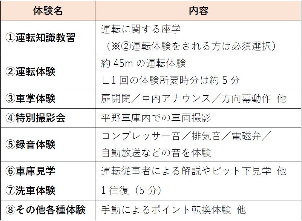 (9)体験概要 平野車庫でのご希望の体験コンテンツ90分間