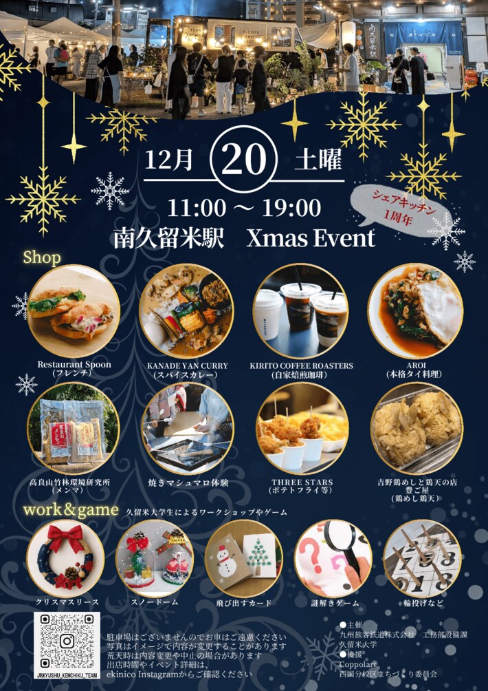 南久留米駅のシェアキッチン「Share Kitchen Minamikurume」は、12月24日で1周年を迎えます!これを記念して、ekinico南久留米駅で素敵なクリスマスイベントを開催します。