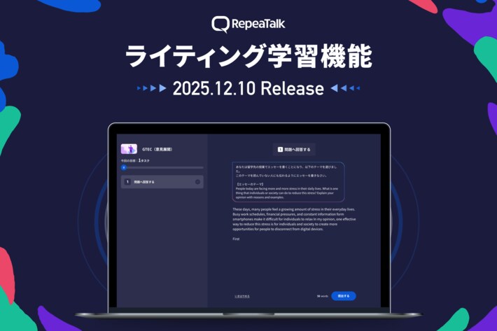 コトバンク株式会社(本社:東京都渋谷区、代表取締役:小泉 純)は、英語音読クラウド「リピートーク」に搭載されている英語学習AI「AIパフォーマンス」において、新たに「ライティング学習機能」を追加しました。