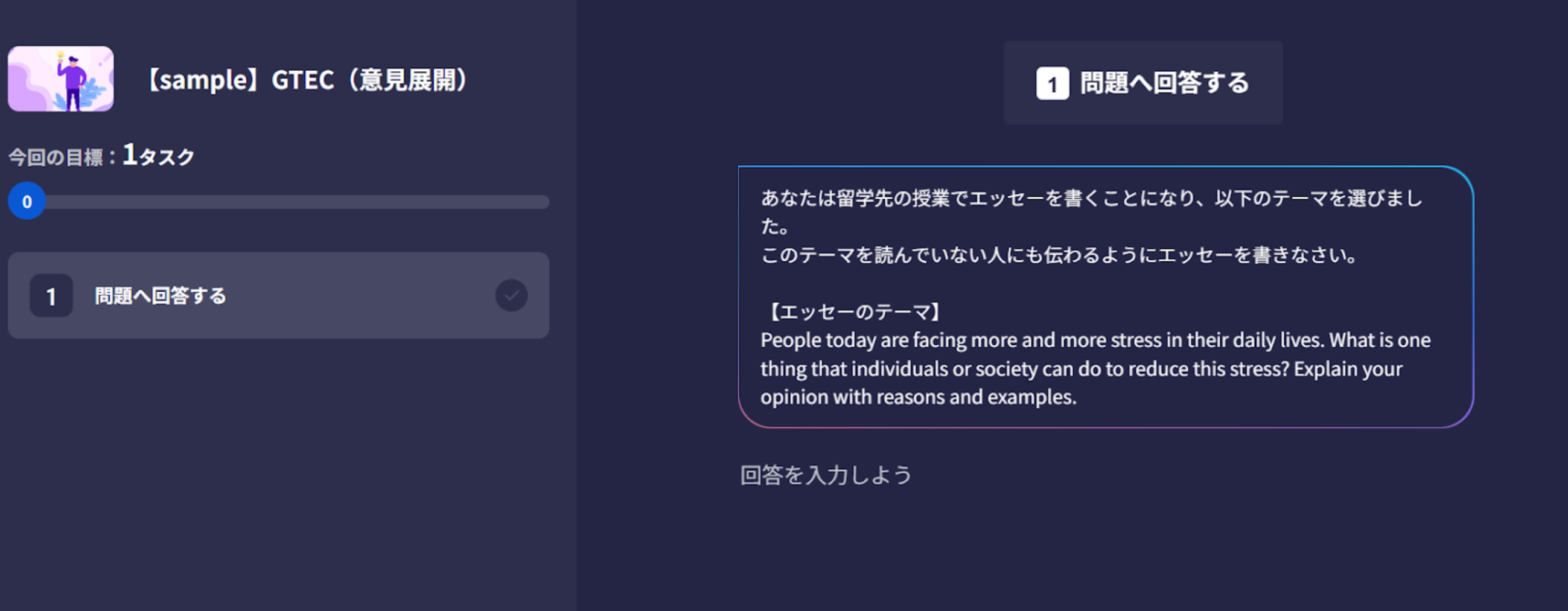 本機能はTEAP、大学入試、小論文型課題など、外部試験で求められる記述式ライティング形式に対応し、課題提示 → 自動添削 → リライト(再提出)までを一貫してサポートします。