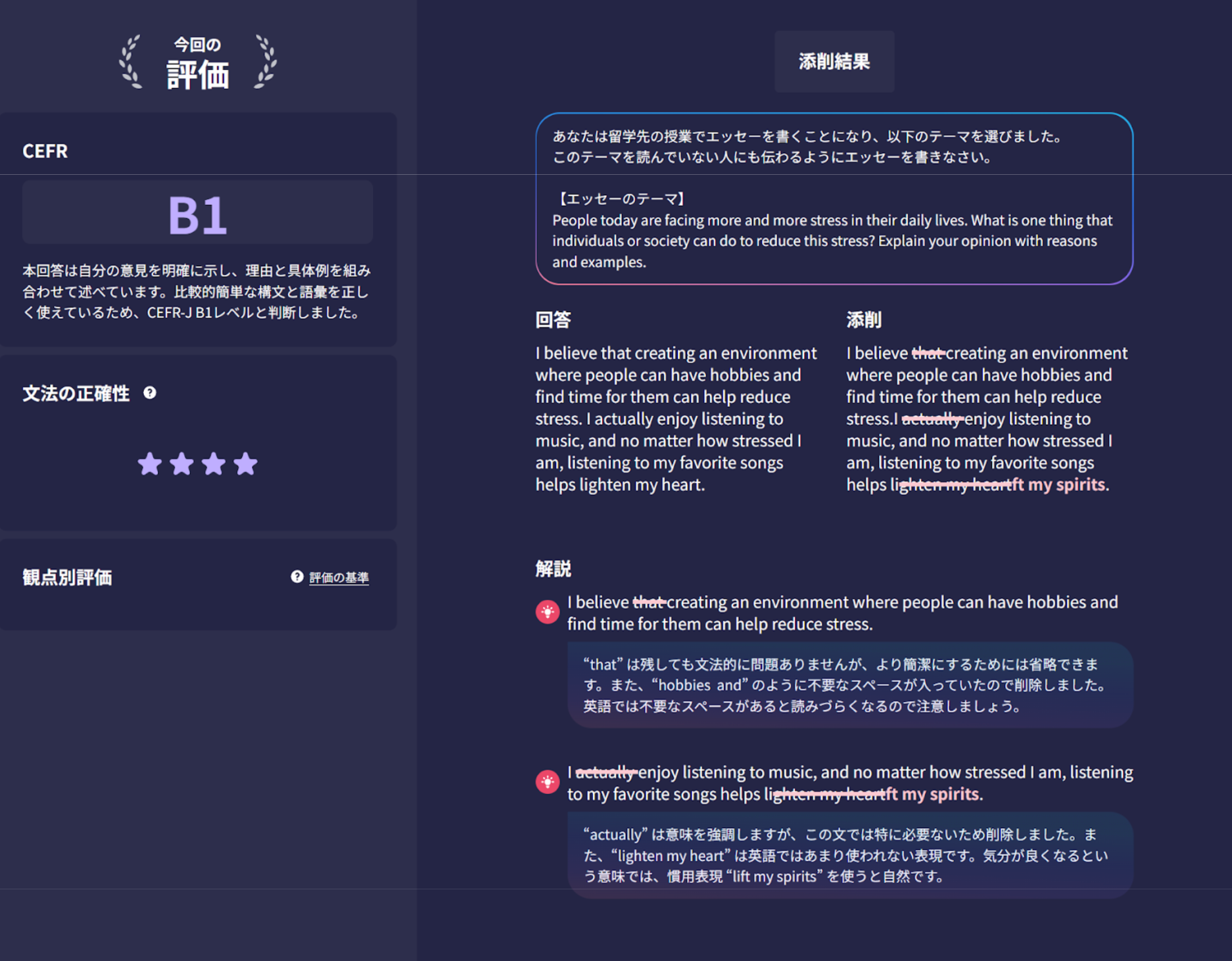 語彙・文法・構成・内容などの観点別フィードバックを提示。