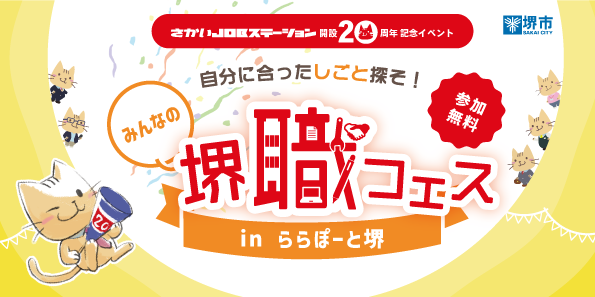堺市では、地域の雇用促進を図るため、さかいJOBステーション主催の「堺職フェスinららぽーと堺」を開催します。本イベントでは、さかいJOBステーション開設20周年を記念し、お笑い芸人と市内企業によるスペシャルトークイベントを行います。また、市内企業との交流イベントや各専門機関による個別就職相談等、無料で参加いただけるお仕事探しに役立つ情報満載イベントです。