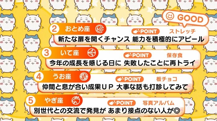『めざましテレビ』で放送中の「ちいかわ占い」 テレビ放送がない日はお休みで、月~土:朝7時以降に更新予定です。