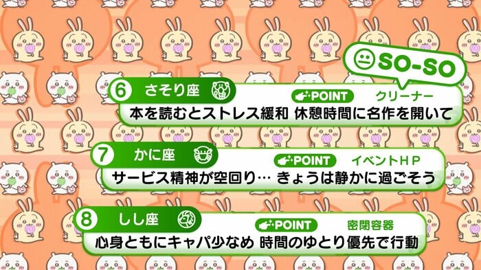 『めざましテレビ』で放送中の「ちいかわ占い」 テレビ放送がない日はお休みで、月~土:朝7時以降に更新予定です。