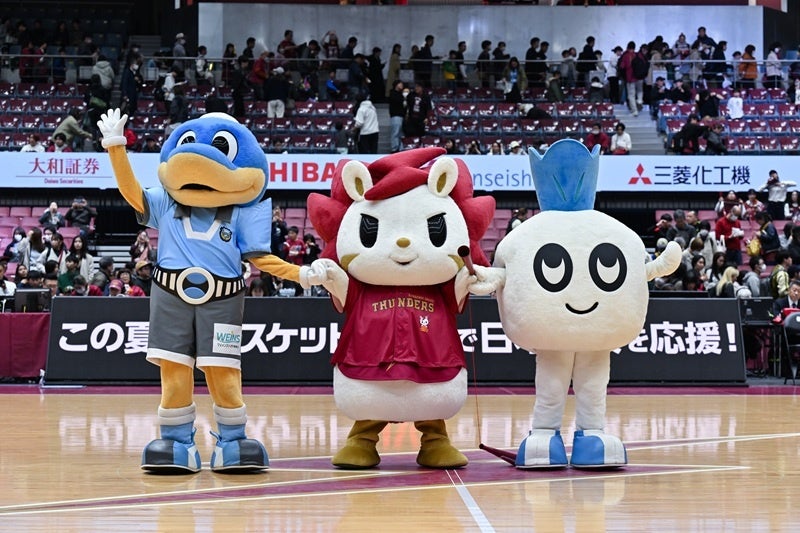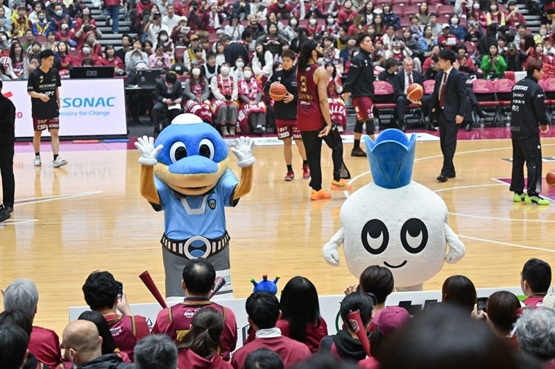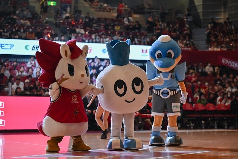 川崎フロンターレのマスコット「ふろん太」と「カブレラ」が来場。川崎ブレイブサンダースのマスコット「ロウル」と共にコート上のイベントに登場して、会場を盛り上げます。