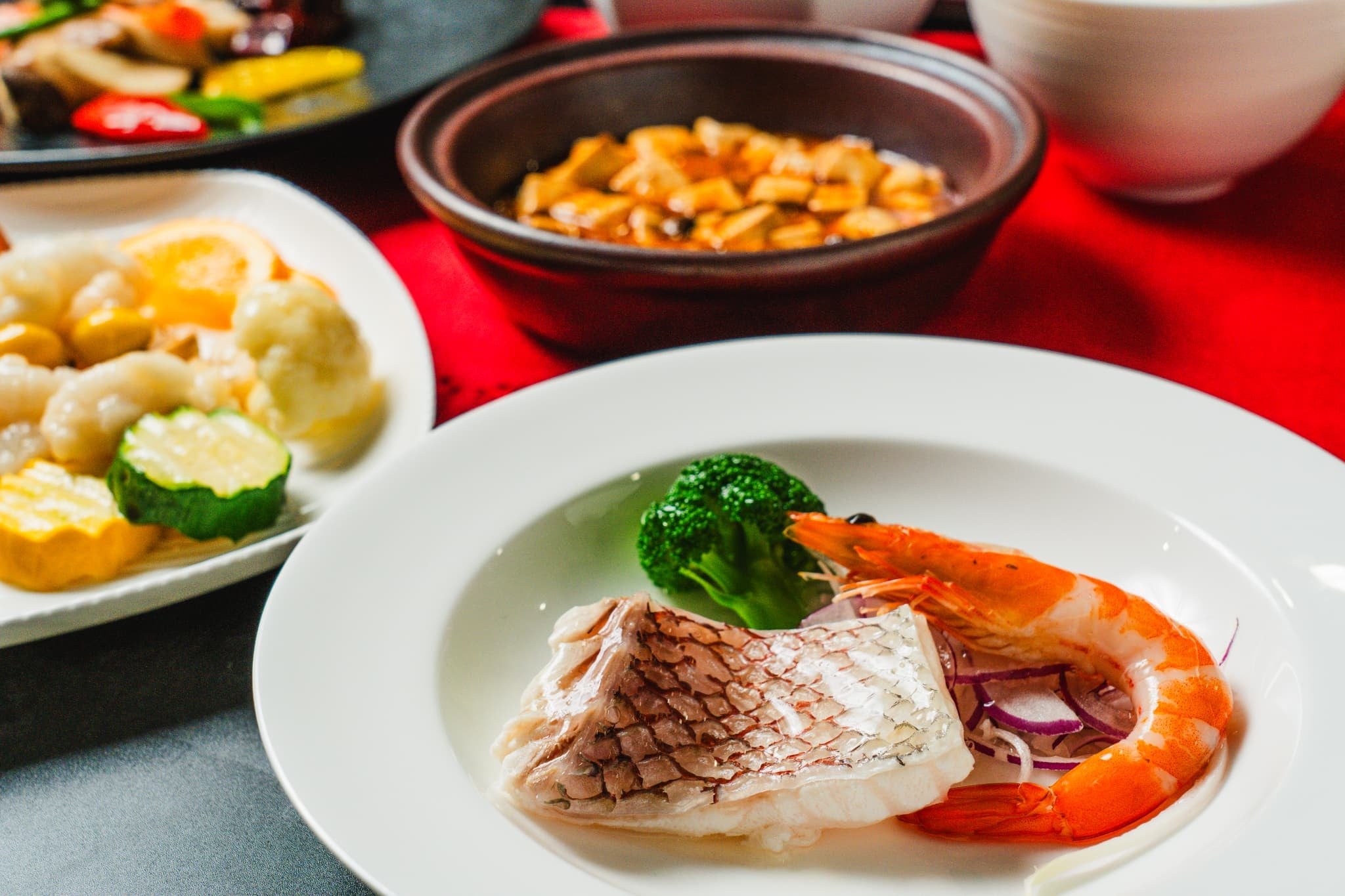 吉切鮫のやわらかな食感に、上海蟹の濃厚な旨味を重ねた深みのある煮込みは、冬ならではの味覚が際立つ贅沢な一皿。さらに県産鮮魚と有頭海老を強火で一気に蒸し上げた料理が続き、素材本来の甘みと香りが広がります。