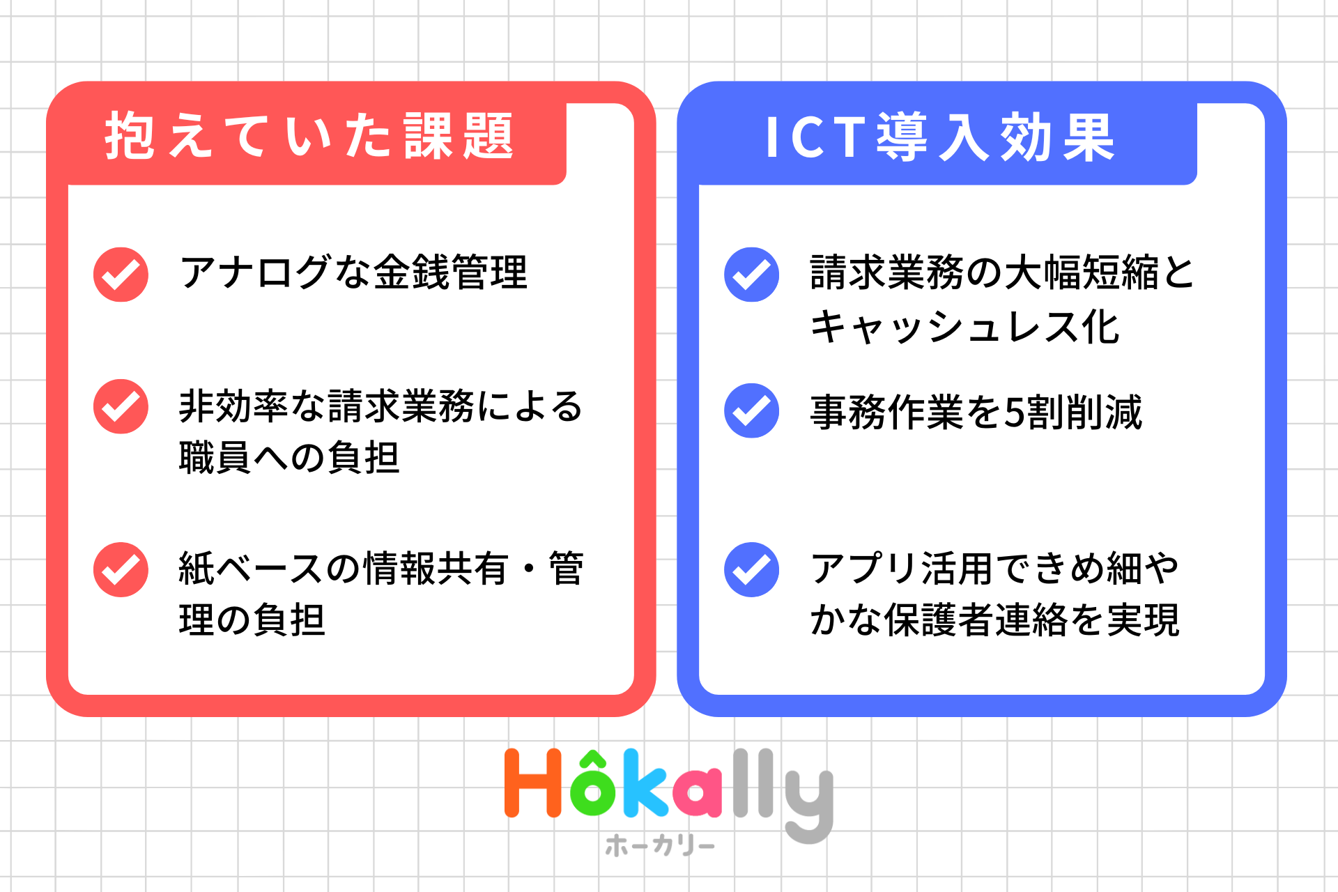 本事例では、3つの施設単位で児童数約120名を抱える大規模施設において、アナログな事務・集金作業をデジタル化することで事務作業を5割削減し、職員が「保育に専念できるゆとり」を確保するまでの流れを詳細に紹介しています。