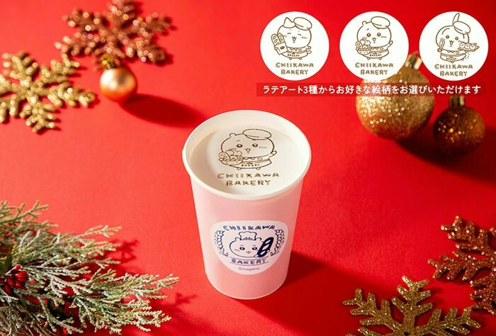 パンの発売に先駆けて、2025年11月28日(金)からは冬にぴったりのドリンクやグッズも登場します。ホットドリンクは、「ちいかわベーカリー」のロゴが入ったオリジナルのテイクアウトカップで提供。特に「ホットカフェラテ」と「ホット抹茶ラテ」は、ちいかわたちの絵柄が選べるラテアート付きで、飲むのがもったいないくらいのかわいさです!