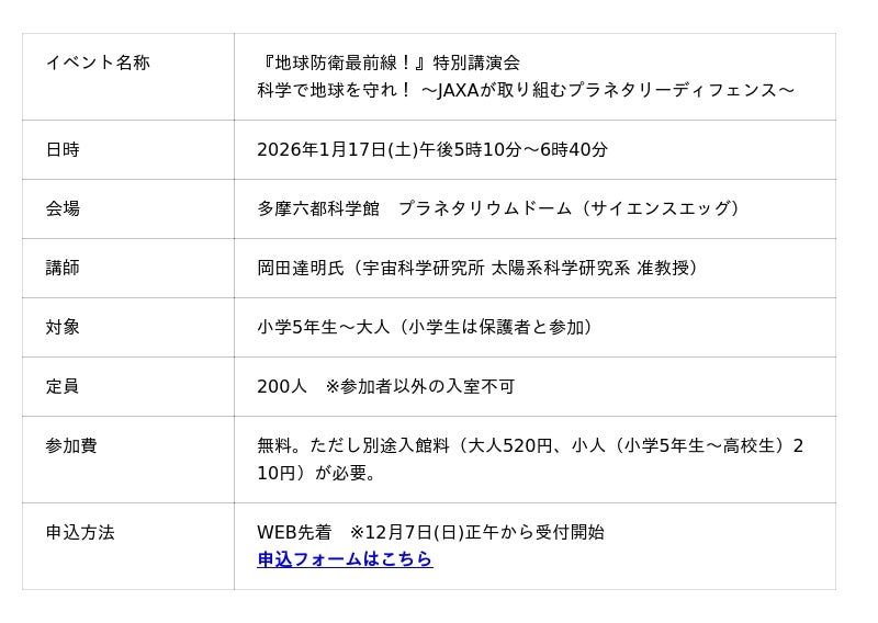 さらに、1月17日(土)には特別講演会「科学で地球を守れ! ~JAXAが取り組むプラネタリーディフェンス~」を開催し、JAXAの研究者とともに、最新の地球防衛の取り組みと地球の未来について考えます。