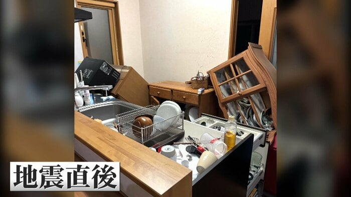 地震直後に撮影した写真を見せてもらうと、電子レンジが倒れ、食器棚は横倒しに…。