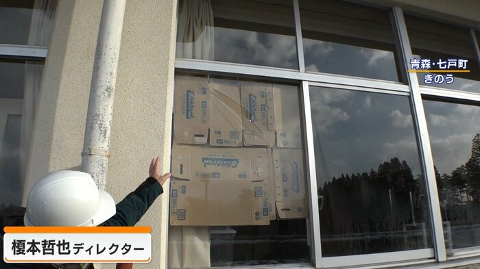 震度5強を観測した、青森県七戸町の七戸中学校では、校舎の窓ガラス31枚が割れ、段ボールで一時的な補強が行われていました。