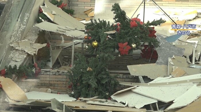 吹き抜けとなっている エントランス周辺には、崩れ落ちたガレキと共にクリスマスの装飾が散乱しています。