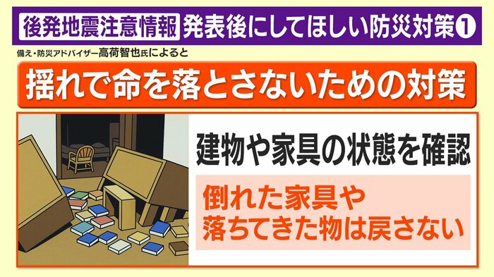 次に「いつでも大きな揺れが来る可能性がありますよ」という状況が今後1週間続きますので、「今、自分が座っているところに倒れてくる物がないか、落ちてくる物がないか」そういった生活スペースを確認して、安全な空間にしておくというのが、今やっていただきたいことです。