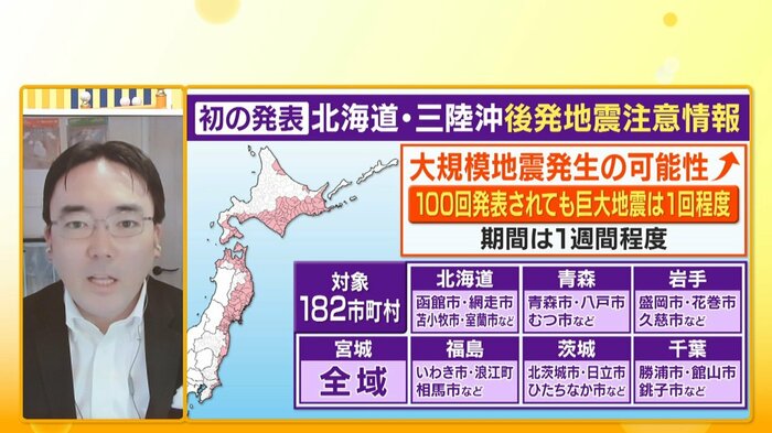 「後発地震注意情報」とは、マグニチュード7.0以上の地震が発生した場合、大規模地震が発生する可能性が、平常時よりも高まったとして、地震や津波への対応など注意を促すもので、今回、想定の対象となったのは、北海道や東北地方だけではなく、茨城県や千葉県などを含めた、182の市町村に及んでいます。