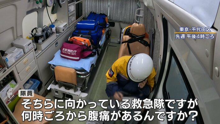 隊員「そちらに向かっている救急隊ですが、何時ごろから腹痛があるんですか?」「吐いたり下痢とかはないですか?ご病気は特にないですかね?」