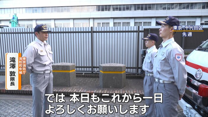 東京消防庁 消防司令塔 滝澤敦隊長「では、本日もこれから一日、よろしくお願いします。気をつけ、わかれ!」