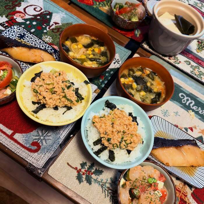 ランチョンマットの上には、定食スタイルで一人ずつ用意された美味しそうなご飯たちが並んでいます。お茶碗には西山さんの地元・新潟産の白米が盛られ、その上にはひきわり納豆がドサっと乗っています。生姜とニンニクが混ざっているそうで、どんな味なのかとっても気になります。