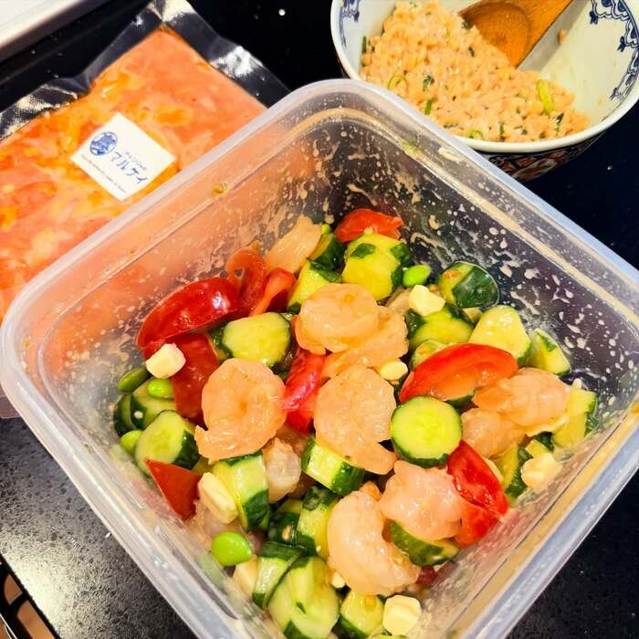 そして、そんなご飯を美味しくいただくためのおかずたちは、銀鱈焼きに、コーンが入った具だくさんのお味噌汁。さらに、冷凍エビを活用したというサラダはきゅうりや、枝豆、赤パプリカなど彩りも豊かでとっても美味しそうです。
