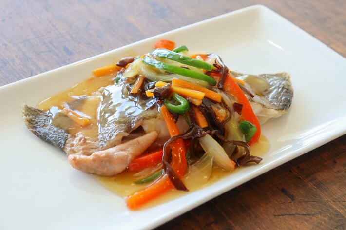 栄養学部生と兵庫漁連が共同開発したレシピ1.「赤ガレイの彩り野菜あんかけ」