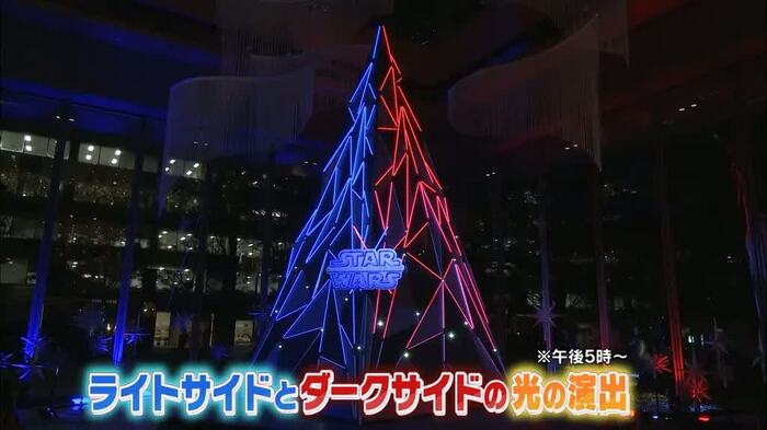 館内にある大きなクリスマスオブジェは午後5時になると、スターウォーズとコラボした光の演出が行なわれる。