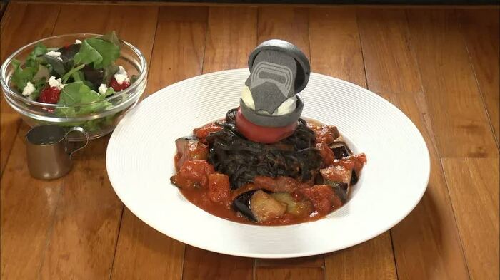 トマトソースの上には真っ黒なイカ墨のパスタ。その上に乗せられた黒いモナカでできたキャラクターの中には、マスカルポーネチーズが入っていて、パスタに絡ませてから食べると絶品!